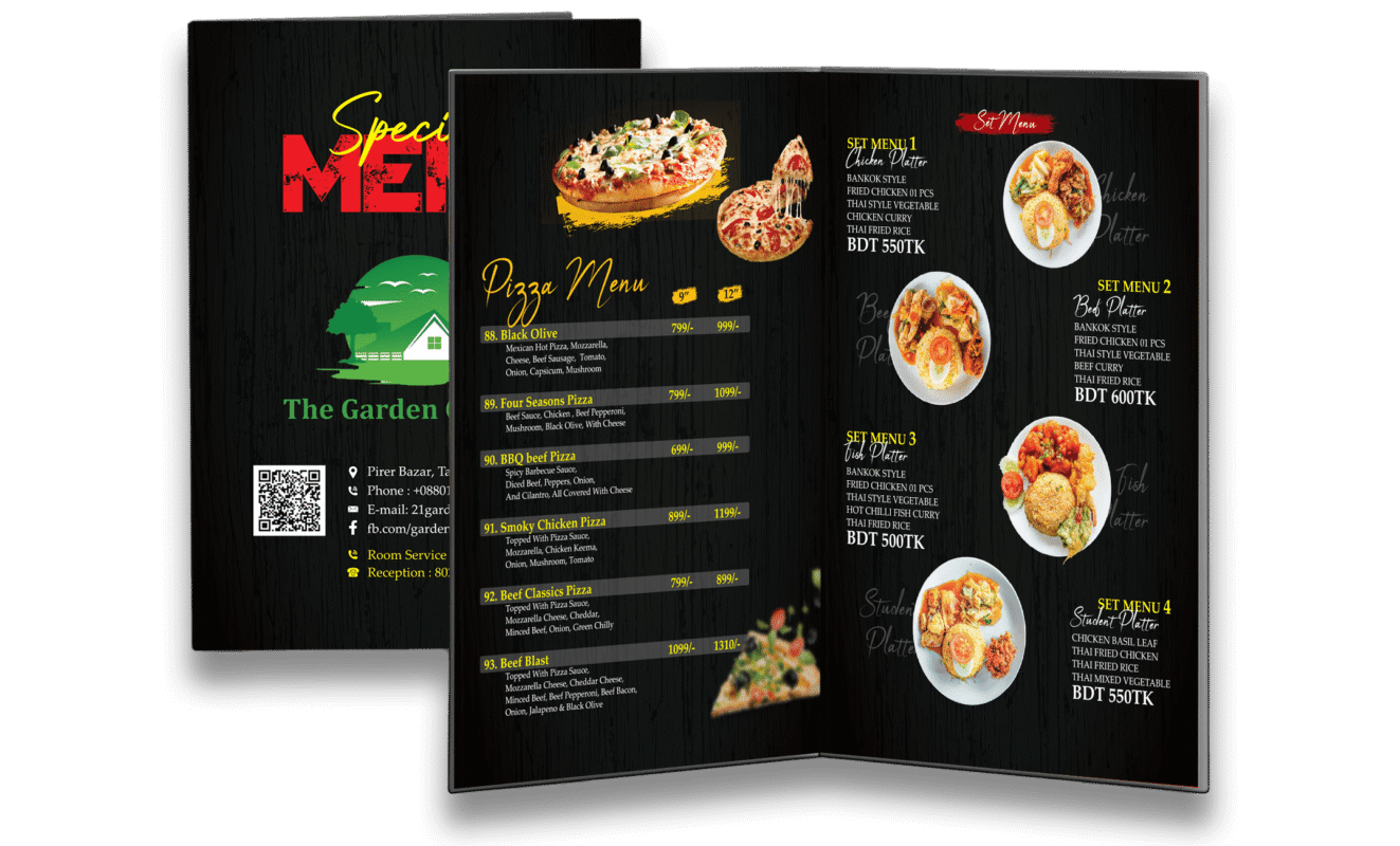 রেস্টুরেন্ট মেনু বইয়ের জন্য কাস্টম ডিজাইন ও প্রফেশনাল প্রিন্টিং সেবা — আপনার পছন্দ অনুযায়ী বিভিন্ন সাইজ, প্রিমিয়াম মানের কাগজ ও দৃষ্টিনন্দন ফিনিশিংয়ের সুব্যবস্থা। আপনার ব্র্যান্ডের মান ও সৌন্দর্য বজায় রাখার নিখুঁত সমাধান।